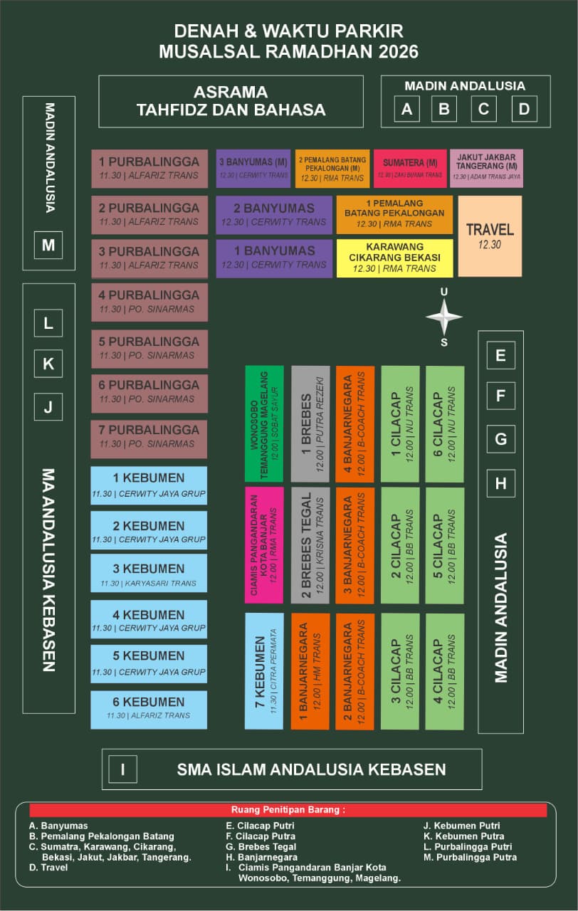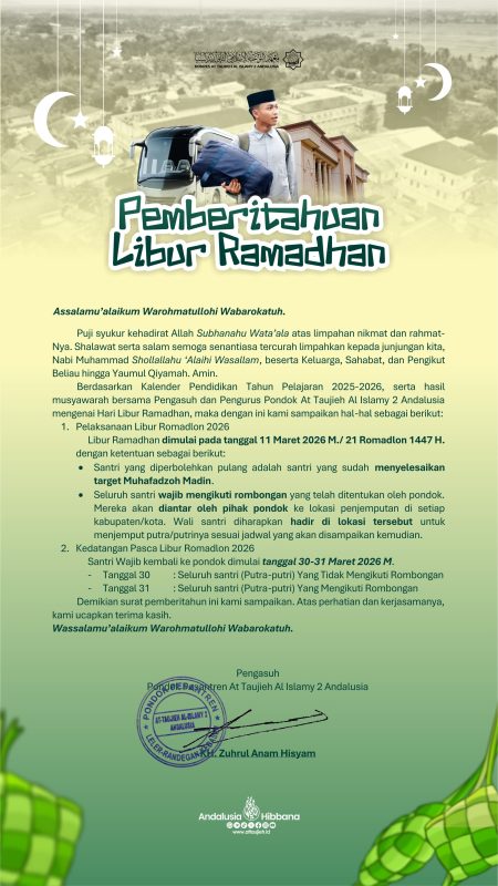 Leler, Jawa Tengah – Pondok Pesantren At-Taujieh Al-Islamy 2 Andalusia resmi merilis informasi mengenai Mudik Santri Andalusia Masal (MUSALSAL) dan Libur Ramadhan tahun 2026. Keputusan ini ditetapkan berdasarkan Kalender Pendidikan Tahun Pelajaran 2025-2026 serta hasil musyawarah bersama antara Pengasuh dan Pengurus Pondok Pesantren At-Taujieh Al-Islamy 2 Andalusia. Kegiatan mudik massal yang mencakup wilayah Jawa Tengah, Jawa Barat,Jawa Timur, Jabodetabek dan Luar Jawa ini bertujuan untuk mengatur kepulangan santri secara terkoordinasi dan tertib.